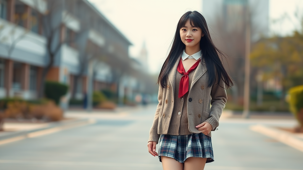 A charming 18-year-old girl in a school uniform featuring a cardigan sweater, tailored jacket, and a plaid mini skirt; she has a curvy figure and long black hair cascading down her back. The scene is set with soothing tones, muted colors, and gentle yet striking contrasts. Saturated hues subtly highlight the playful atmosphere as she strolls leisurely across the school grounds, exuding a sense of youthful elegance and vibrancy. Despite the serene setting, attention to details ensures a polished composition, maintaining an engaging and coherent visual narrative.