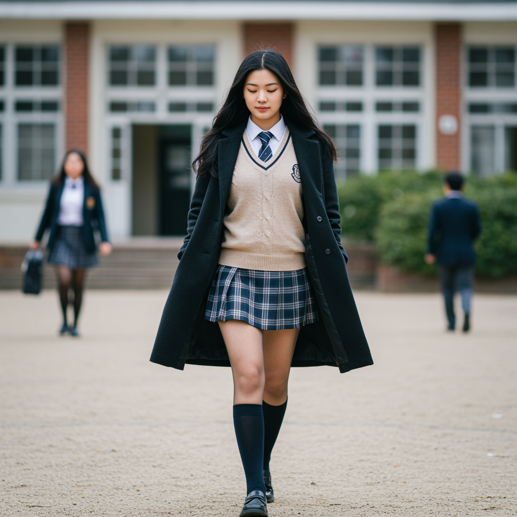 A charming 18-year-old girl in a school uniform featuring a vest sweater, coat, and plaid mini skirt, with a curvy figure and long black hair. She walks gracefully across the school grounds, framed by soothing tones and muted colors. The scene is enriched with high contrast and vibrant saturation, capturing the elegance and essence of youth.