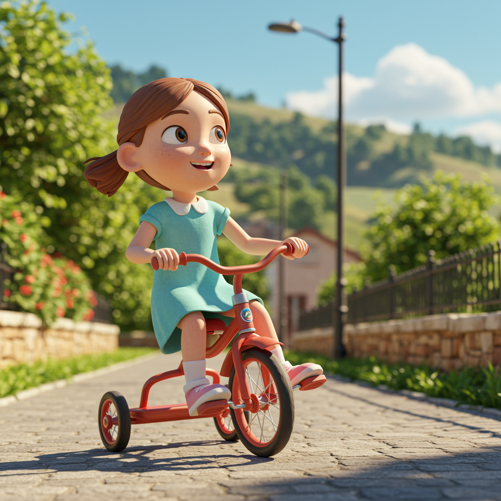 A charming 6-year-old girl, delightfully riding her tricycle down a picturesque street on a sunny day, crafted in ultra-realistic 3D art style. Rendered in C4D using Octane with ray tracing, the scene features clay materials reminiscent of Popmart blind box figures and captures the vibrant essence of Pixar's animation lighting trends. With a compelling depth of field, the background softly blurs to enhance focus on the detailed elements. The bright and cheerful ambiance of the day adds to the whimsical allure, showcasing intricate textures and shading. The aspect ratio is 9:16, ensuring a tall, immersive visual experience with a quality setting at its peak.