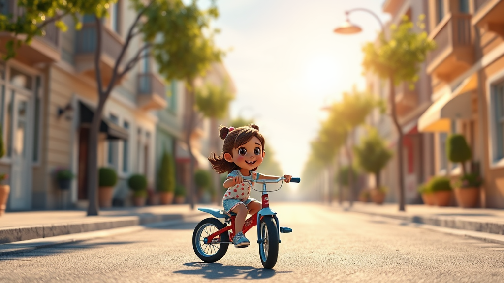 A charming 6-year-old girl rides her tricycle down a picturesque street on a bright sunny day, in 3D art style using Cinema 4D and Octane Render, featuring ray tracing and clay material textures. Inspired by Popmart blind boxes and Pixar-style animation, the scene is lit with dynamic animation lighting and a shallow depth of field for an ultra-detailed effect. The artwork captures a whimsical, playful essence with a vertical aspect ratio of 9:16, incorporating creative elements like subtle lens flares and soft dappled shadows to enhance the enchanting ambiance.