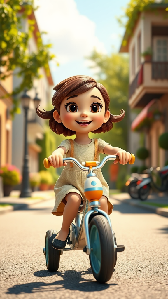 A charming 6-year-old girl riding a tricycle down a picturesque street on a sunny day, created with 3D art using C4D and Octane Render. The scene features ray tracing and clay materials, evoking a Popmart blind box and Pixar animation style. Expert lighting and depth of field highlight ultra-detailed elements, capturing the joyful essence of childhood. Aspect ratio is 9:16, with quality set at 2, smoothness at 300, and version 5 enhancements.