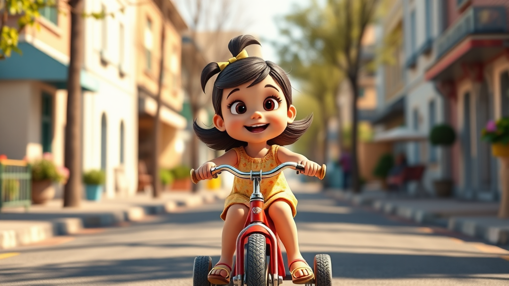 A charming 6-year-old girl riding her tricycle down a picturesque street on a sunny day, rendered in stunning 3D art using c4d and octane for a realistic effect. The scene features ray tracing with clay material, exuding the style of a Popmart blind box with a Pixar-inspired trend. The lighting is akin to animation, with deep depth of field and ultra-detailed visuals, capturing the joyful essence of her ride. The aspect ratio is 9:16, with quality and style emphasized at level 2, maintaining a vibrant and whimsical atmosphere.