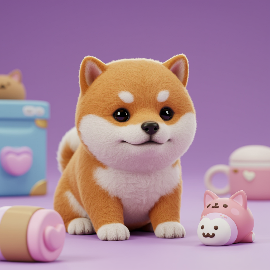 A charming and adorable baby shiba inu puppy rendered in 3D with intricate octane style, reminiscent of the enchanting visuals from Fortnite. The scene features studio lighting that highlights the puppy's soft, cuddly fur in gentle, pastel colors. The focus is on ultra-realistic detailing, capturing every nuance, from its playful expression to the tiny whiskers. Surrounded by whimsical, imaginative props that enhance its cuteness, the setting is designed to evoke warmth and delight, making the shiba inu the heart of this hyper-realistic portrayal.