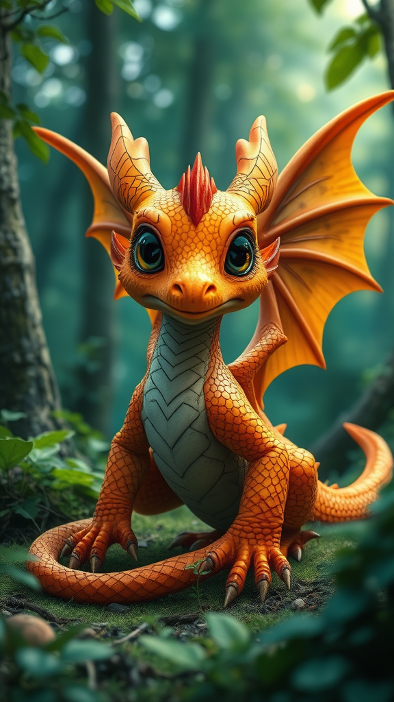A charming and adorable orange dragon nestled in a verdant forest setting, a DnD character with rich fantasy elements. The scene highlights the dragon's detailed, realistic textured skin, adorned with eagle feathers and falcon-like wings. Its lizard-like legs are poised in a powerful, komodo-inspired stance, resembling a raptor's agility. The dragon's large, glowing eyes exude a magical allure, captivating and mystical.
