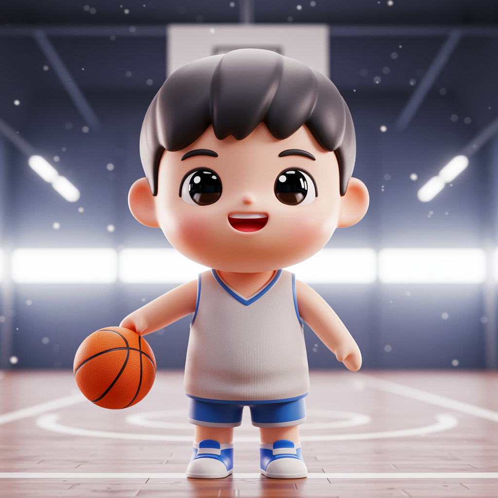 A charming and adorable sports boy with a cheerful demeanor, wearing a sleek basketball vest and vibrant blue shorts. His large, expressive eyes sparkle with excitement, set against a pristine, luminous basketball court background. The scene is infused with a dreamy, high-energy vibe, capturing the essence of an animated boy in playful motion. Designed in a whimsical style, reminiscent of pop culture and collectible figures, the character exudes fine luster and exquisite craftsmanship. Depicted in an ultra-detailed 8k resolution with bright, inviting colors, the front-lit face shot showcases his inviting and gleeful expression, bringing this endearing sports enthusiast to life in a captivating 3D render.