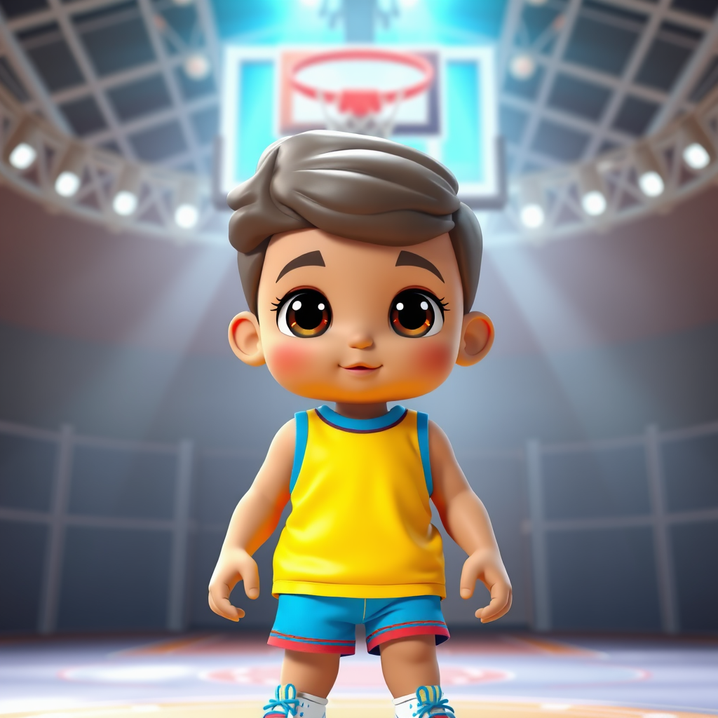 A charming and adorable sports kid, donned in a vibrant basketball jersey, paired with azure shorts, showcasing large, expressive eyes. Set against the backdrop of a pristine, luminous basketball court, the boy exudes a dreamy and enthusiastic aura. Inspired by pop mart designs, this high-detail, hyper-quality image embraces bright colors, Disney-style aesthetics, and boasts a polished, glossy finish. The scene is a 3D render with exceptional clarity, rendered in 8k resolution, highlighted with frontlighting to accentuate the face shot and intricate details, creating a visually stunning, collectible toy mockup feel.
