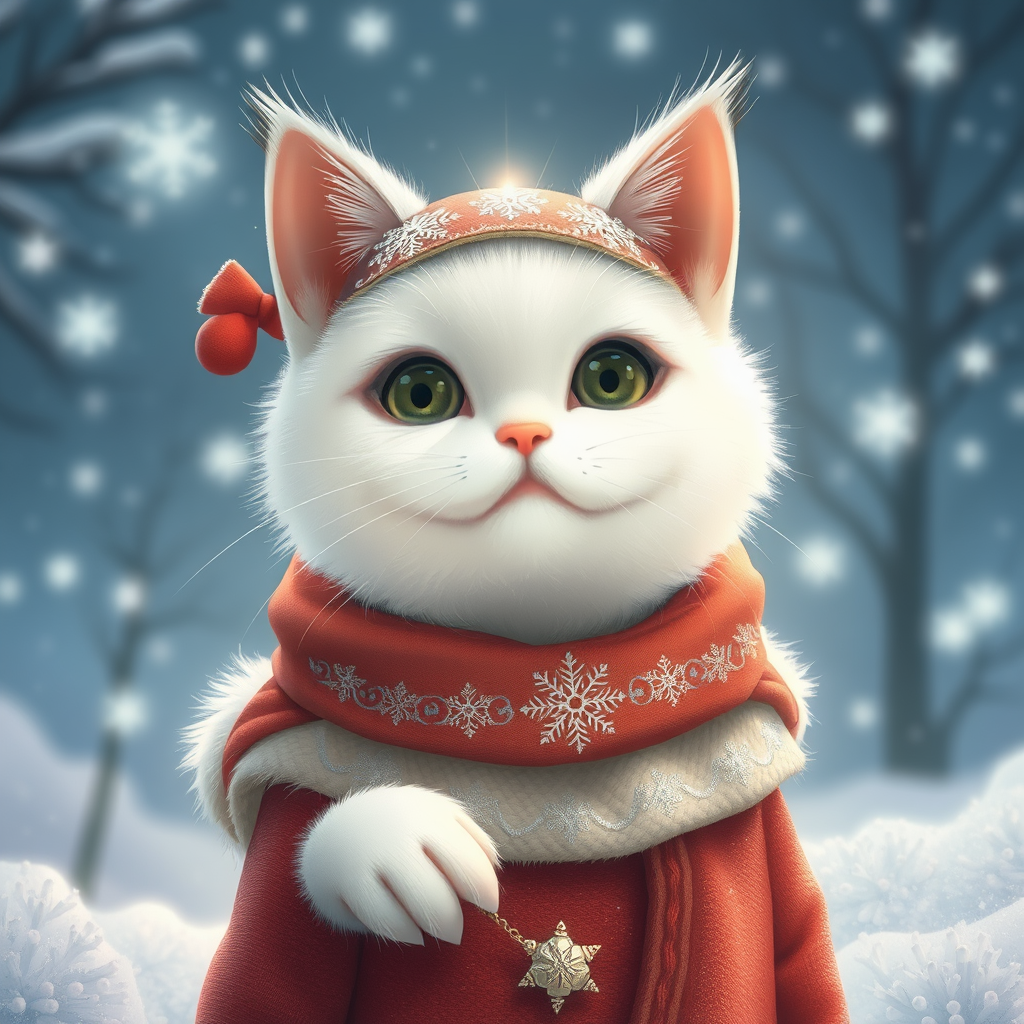 A charming and enchanting white cat, exuding an adorable and magical vibe, blended with a surreal and ethereal presence. It dons winter fashion adorned with delicate silver filigree details, set against a picturesque snowy backdrop, sparkling with snowflakes and shimmering stars. The scene is envisioned by the creative minds of Yoshitomo Nara, Ray Caesar, and Studio Ghibli, capturing a whimsical and dreamlike ambience with a touch of winter wonder.