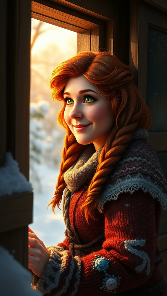 A charming and spirited dwarven woman with a round and cheerful demeanor stands by her window, gazing out at the snow-covered landscape. Her beautifully detailed face is illuminated by the soft glow of the golden hour, her lively green eyes reflecting the warmth of her cozy home. Her luxuriant red hair is intricately braided, cascading down her shoulders, complementing her hearty and robust features, including a prominent, endearing nose. The scene exudes a sense of fantasy art influenced by Dungeons and Dragons and the enchanting worlds of Lord of the Rings. The style blends the luminous, idyllic charm of Thomas Kinkade with the surreal intricacy of Wojciech Siudmak's art, creating a scene of extraordinary texture and depth. Every detail is rendered in smooth, sharp focus, enhanced by the effects of ray tracing, making the snow outside appear vivid and dynamic against the serene backdrop of her snug dwelling. The ambiance is one of warmth and magic, inviting viewers into a world where fantasy meets realism, perfect for concept art on platforms like ArtStation.