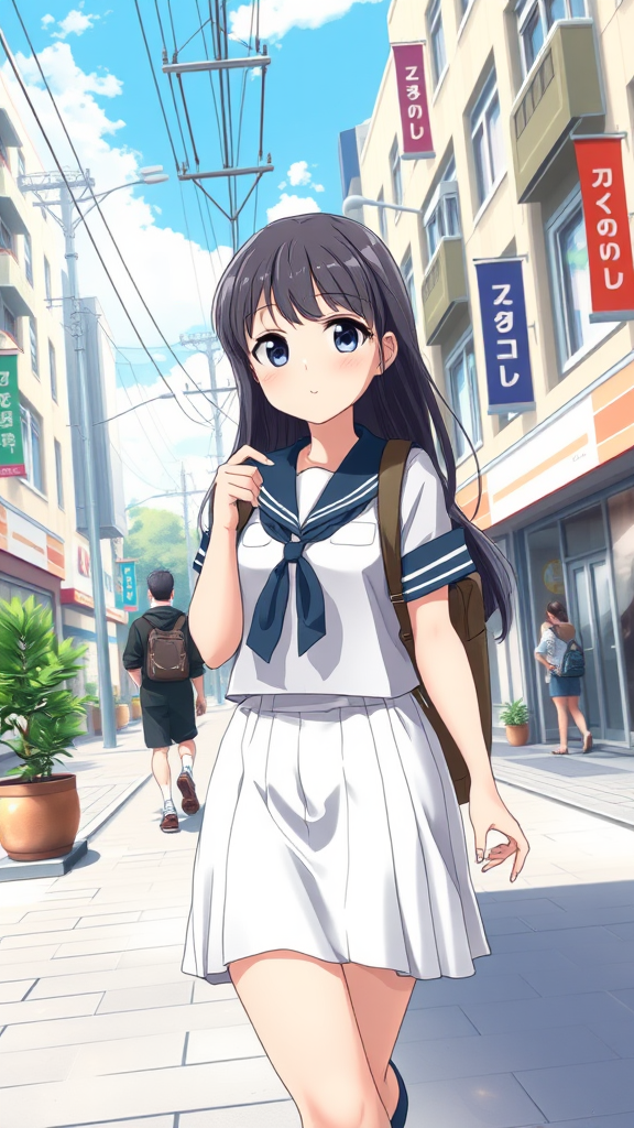 A charming anime girl leisurely walks down a lively street, dressed in a crisp school uniform. The scene captures her youthful grace and appealing cuteness through smooth CG art, showcasing her as a beautiful high school student in a vibrant cityscape. Rendered in a realistic 3D anime style, she embodies the essence of a visual novel key visual, with meticulous attention to detail in her expressions and surroundings. The painted quality reflects the care of an anime artist’s touch, bringing a lifelike realism to this young schoolgirl's adventure-filled day.