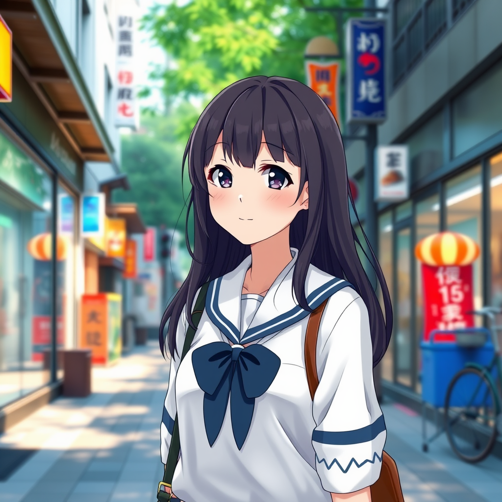 A charming anime girl strolling down a bustling street, dressed in a crisp school uniform, crafted in a smooth and polished anime CG style. Her youthful allure captures the essence of a beautiful high school girl, rendered in a realistic 3D anime aesthetic. This scene evokes the feel of a visual novel key visual, with a focus on a cute young anime girl. The art is meticulously created as if painted in an anime studio, showcasing a realistically detailed schoolgirl who embodies a lifelike anime art style.