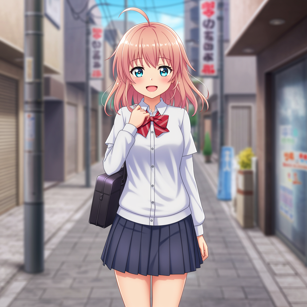 A charming anime girl strolls down a bustling street, dressed in a pristine school uniform, her youthful and vibrant presence captured in a smooth and realistic 3D anime style. Her radiant smile and sparkling eyes make her a captivating and beautiful high school protagonist, reminiscent of a visual novel heroine. The scene is painted with an expert touch, reflecting the intricate details of a bustling urban backdrop, while highlighting the girl's expressive features in a visually striking art style that blends photorealism with classic anime charm. Her character design embodies the essence of a youthful and lively spirit, creating an inviting and engaging anime experience.