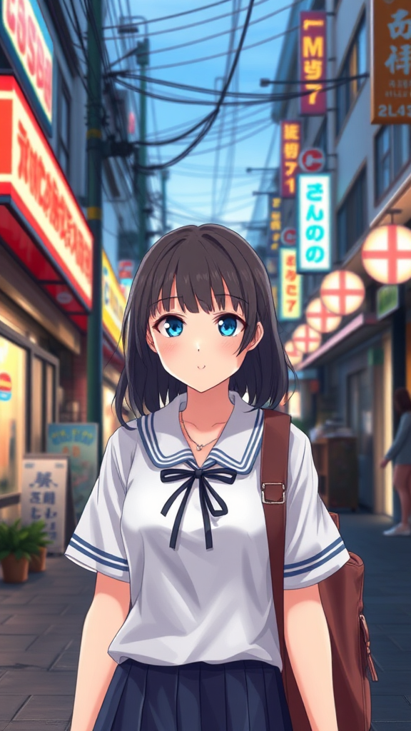 A charming anime girl strolls down a bustling street in her school uniform, embodying a flawless blend of smooth CG art and a visual novel aesthetic. This captivating scene presents a beautiful young high school girl, rendered in a realistic 3D anime style, exuding a youthful elegance. The setting is reminiscent of a visual novel key visual, capturing the essence of a painted masterpiece in an anime studio. Her lively eyes and serene expression embody the realism and artistic flair typical of an anime schoolgirl, merging delicacy with a stunningly lifelike art style.
