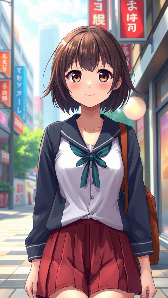 A charming anime girl strolls down a vibrant city street, her school uniform catching the light with its rich, detailed textures. Her expressive eyes reflect a blend of curiosity and wonder, embodying the essence of a visual novel key visual. The scene is a blend of realistic anime 3D style, showcasing the high school girl's elegance and grace. Set in a painterly anime studio style, this art captures the youthful spirit and beauty of a realistic schoolgirl, merging fantasy and reality in a captivating display of artistic skill.