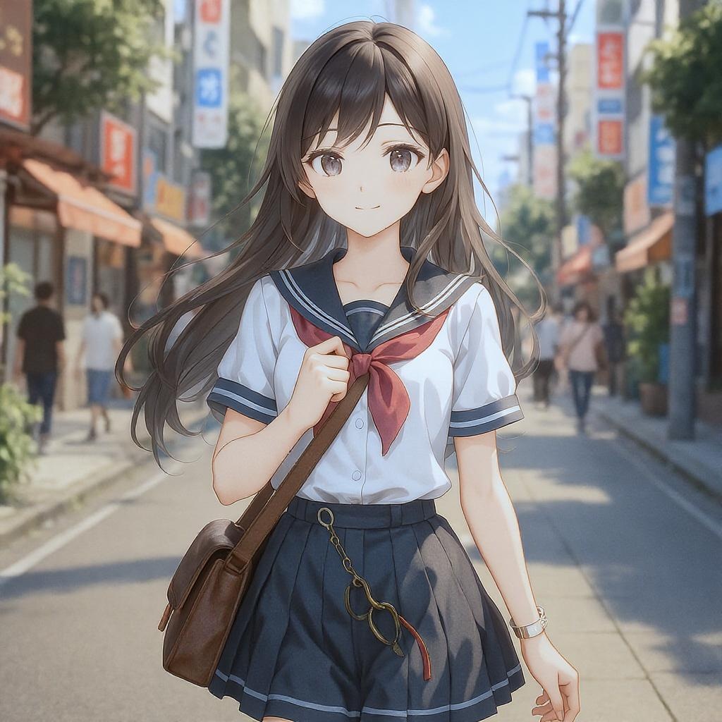 A charming anime girl strolls leisurely down a bustling street, her school uniform impeccably stylish and bathed in the vibrant afternoon light. Her features are rendered in smooth, high-quality CG anime art, embodying the essence of a beautiful high school heroine with lifelike detail. This realistic 3D-style depiction captures her expressive eyes and flowing hair, evoking a sense of youthful vitality. She exudes a sweet yet determined aura, akin to a central character in a visual novel's key visual. Her presence is striking and meticulously painted, as though she has stepped out of a renowned anime painter's studio, her attire and demeanor portraying a perfect blend of realism and classic anime charm.