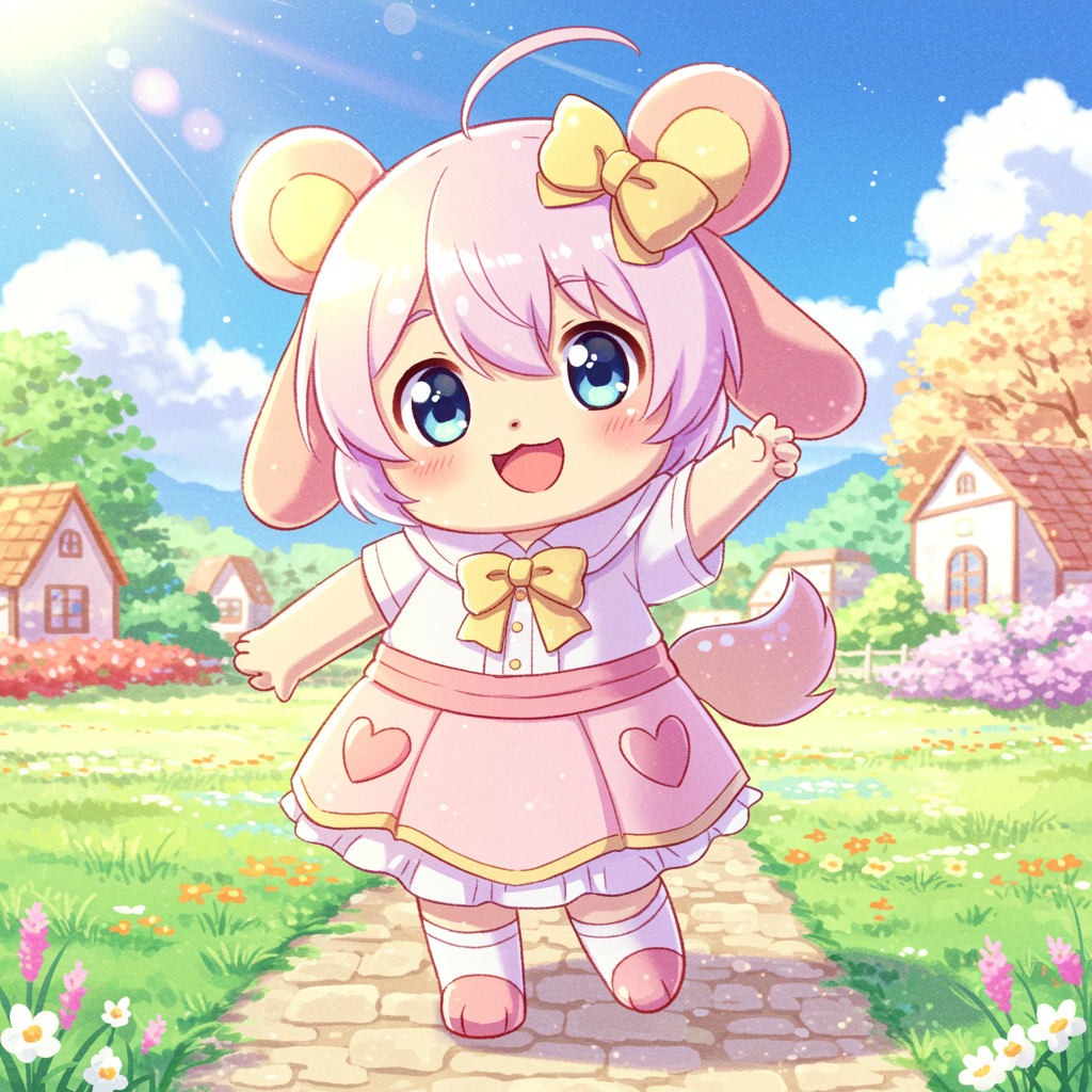 A charming anime mascot melting into delightful pastel tones, merging seamlessly into a gentle, inviting palette, exuding happiness and warmth, bathed in a tender, golden glow, reminiscent of Bryan Hitch's dynamic style, captured from a low-angle perspective, gazing playfully at the viewer, with a charming lens flare effect, set against a whimsical fairytale landscape that enchants the imagination --ar 2:3 --niji 5.