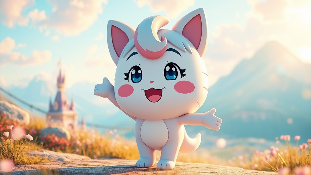 A charming anime mascot playfully melting into delightful, pastel colors, seamlessly merging with a dreamy, pastel palette, radiating happiness and warmth, illuminated by gentle, golden light, influenced by Bryan Hitch's style, captured from a low angle, gazing into the camera, accented by a gentle lens flare, set against an enchanting fairytale landscape in the background.
