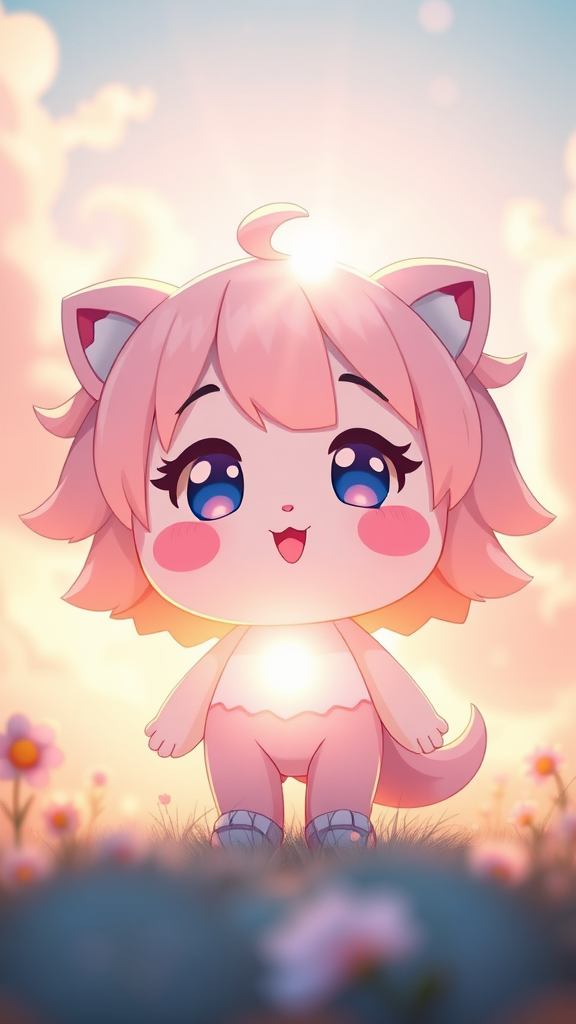 A charming anime mascot slowly melding into delightful pastel tones, harmonizing with a soft, pastel backdrop, radiating happiness and warmth, bathed in gentle, golden light, drawing inspiration from Bryan Hitch, low angle perspective, facing the viewer, with a whimsical lens flare, set against a fairy tale landscape.