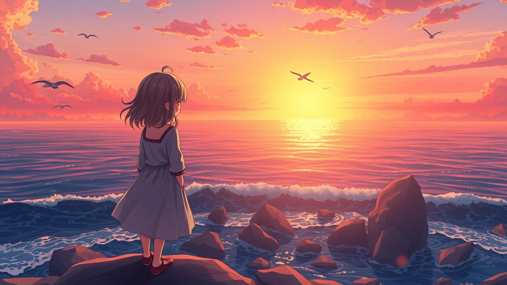 A charming anime scene featuring an adorable girl gazing at a breathtaking sunset over the ocean, standing gracefully at the edge of a rocky cliff, her hair gently tousled by the sea breeze, her eyes reflecting the vibrant hues of orange and pink in the sky, ocean waves crashing against the rocks below while distant seagulls soar across the horizon.