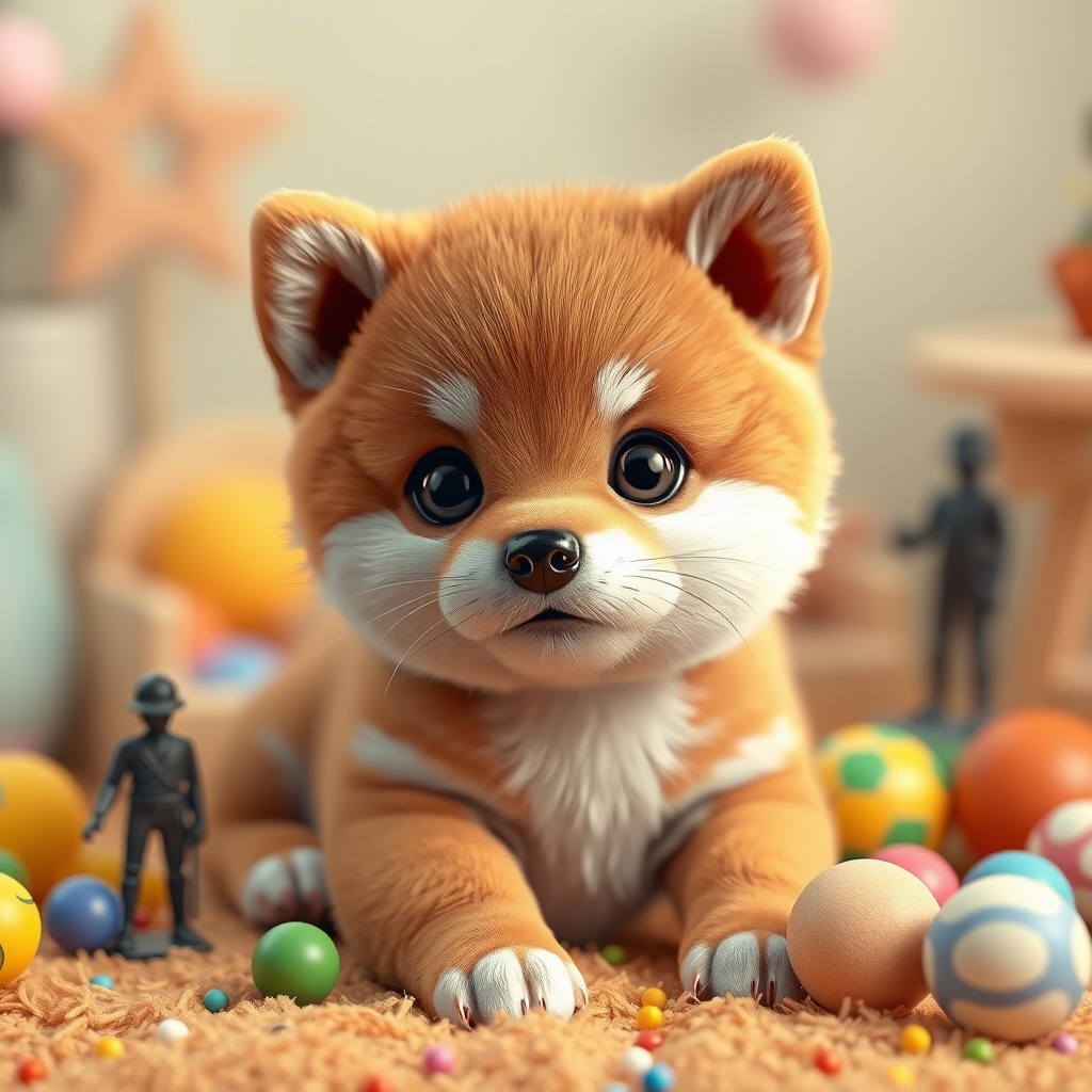 A charming baby Shiba Inu puppy, crafted in a 3D octane render with a whimsical Fortnite style, showcasing delicate intricacies, studio lighting, and gentle pastel hues. The scene embraces an endearing atmosphere, packed with detailed props and an ultra-realistic quality that captures the puppy's playful innocence and fluffy texture. Surrounded by playful elements like tiny toy soldiers and colorful bouncing balls, the puppy's expressive eyes and perky ears add to its irresistible cuteness, inviting smiles from all who view this delightful masterpiece.