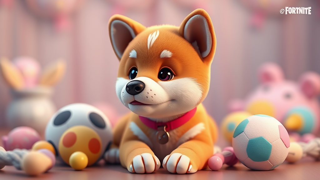 A charming baby shiba inu puppy crafted in a 3D render with a Fortnite-inspired style, showcasing intricate details and studio lighting. Emphasizing soft, pastel colors to enhance its cuteness, this ultra-realistic portrayal includes an array of playful props, highlighting the puppy's adorable nature amidst a highly detailed and whimsical setting.