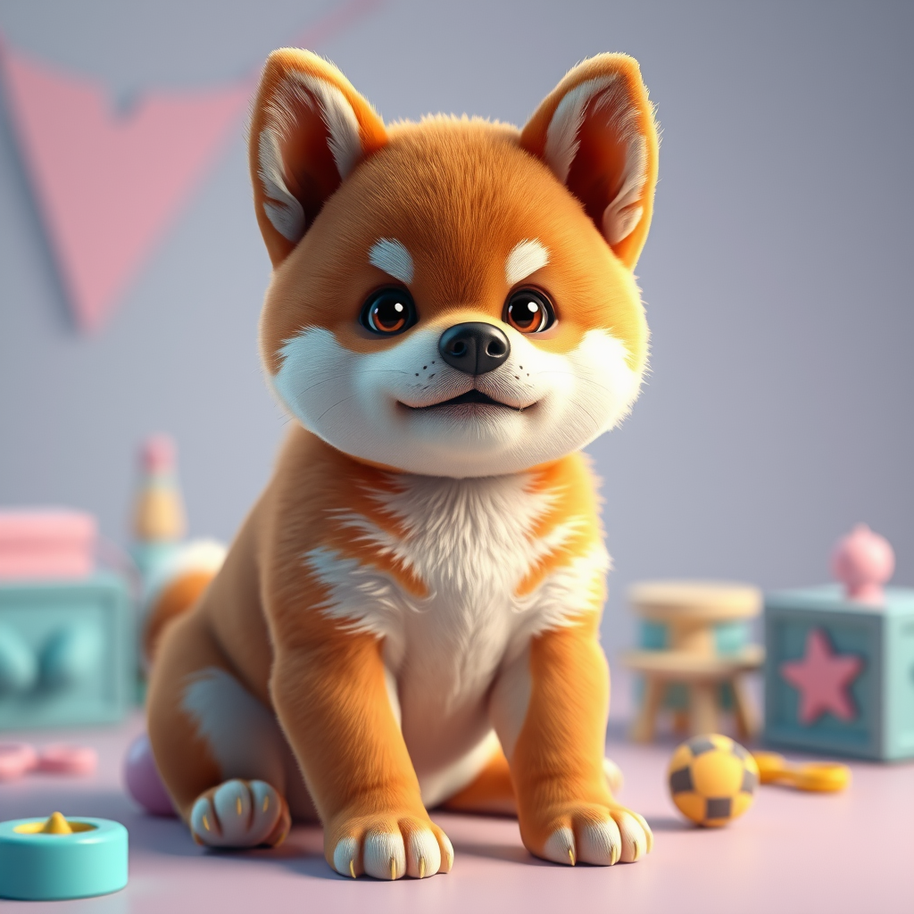 A charming baby shiba inu puppy, hyper-realistically rendered in 3D with intricate features and a Fortnite-inspired aesthetic. The studio lighting highlights the soft, pastel colors of the puppy's fur and the environment. Delicately detailed with playful props around, the scene captures the puppy's adorably curious expression and lively posture, creating an ultra-realistic yet whimsical vibe.