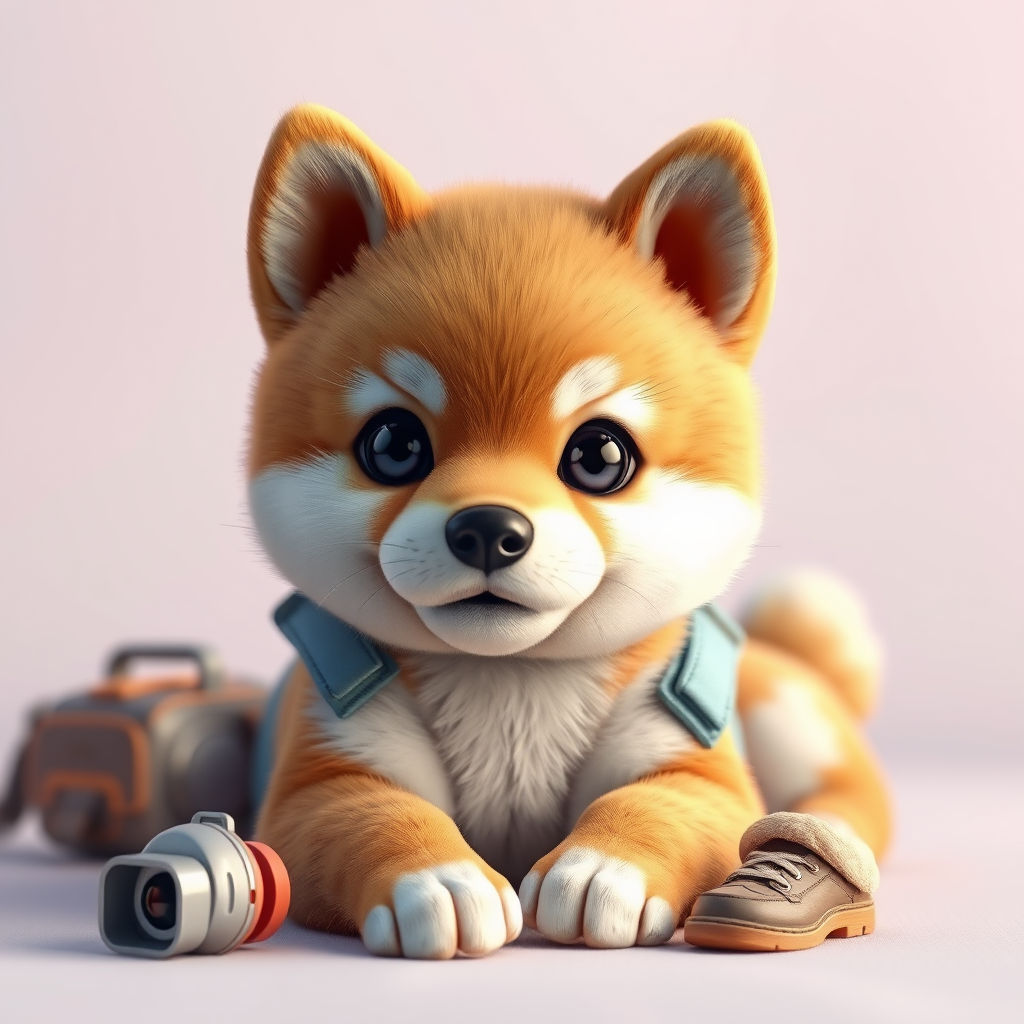 A charming baby shiba inu puppy in a 3D octane render reminiscent of Fortnite style, with mesmerizing intricate details and studio lighting. The scene features soft, pastel colors that add to the cuteness and heightened realism of the puppy, who is playfully surrounded by whimsical props like tiny adventure gear. The render captures an ultra hyper-realistic and delightfully detailed portrayal of this adorable puppy, evoking a sense of playful curiosity and warmth.
