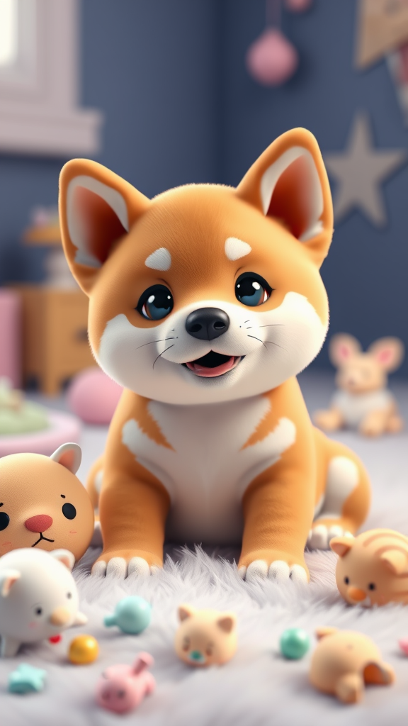 A charming baby shiba inu puppy in a 3D render, designed in a Fortnite-inspired style, showcasing meticulous details and studio lighting. The scene features soft, soothing colors and cute, highly detailed embellishments, with playful props surrounding the ultra-realistic puppy, creating an endearing and lively atmosphere.