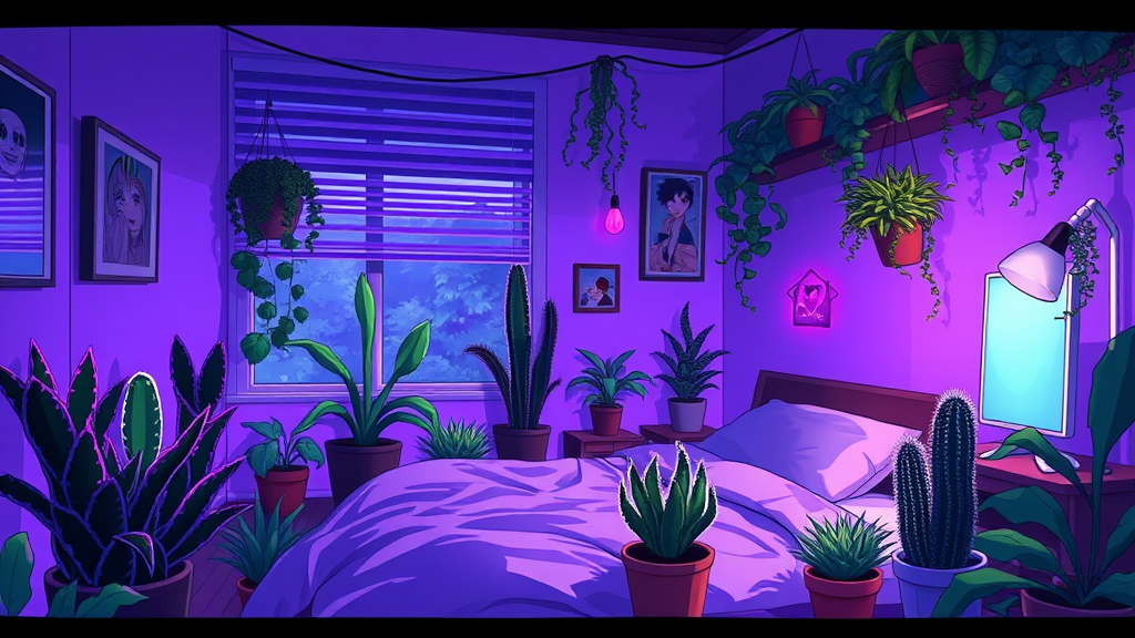 A charming bedroom decorated in an anime-inspired style, enveloped in the serene ambiance of nighttime. The room is dotted with a variety of lush plants, including endearing cacti, casting enchanting shadows in the glow of soft purple lights. This cozy haven is the perfect retreat for a gamer otaku, with nods to their favorite anime and visual novels subtly woven into the decor.