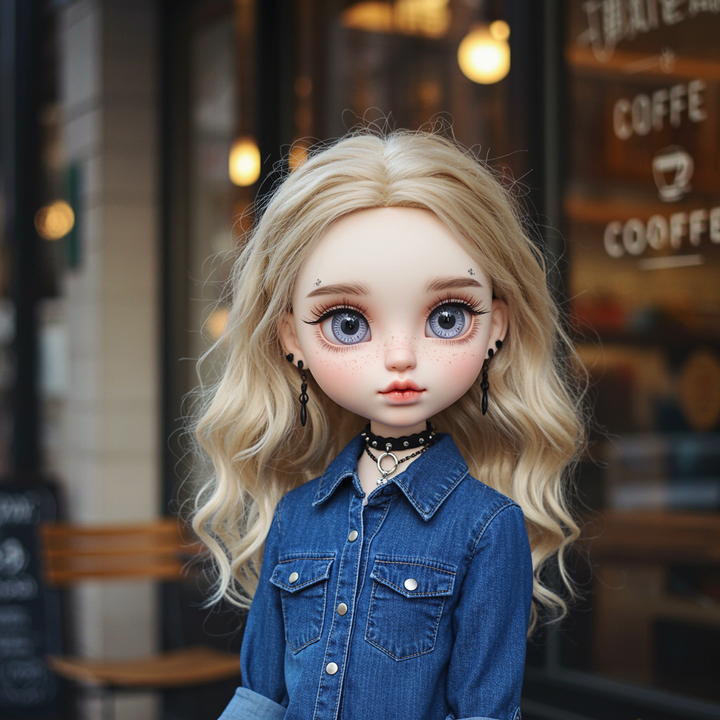 A charming blonde girl with a delightful outfit stands outside a coffee shop, capturing a full-body view in a chibi style. She has airbrushed, slightly crossed eyes, and her appearance is reminiscent of a cute doll. Her wavy hair adds to her charm, and she's accessorized with a stylish Gothic necklace and earrings. Her outfit includes a fashionable denim shirt, complementing her overall look. Despite the artistic style, her features are well-defined and carefully crafted, maintaining a sense of whimsy and playfulness. The background subtly blurs to keep the focus on her, creating an enchanting scene that transports viewers to a lively urban setting.