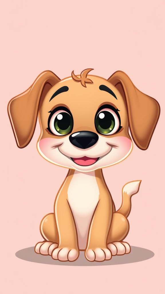 A charming cartoon dog with big, expressive eyes and a friendly grin sits against a pastel background, its wagging tail and floppy ears adding to its playful demeanor.