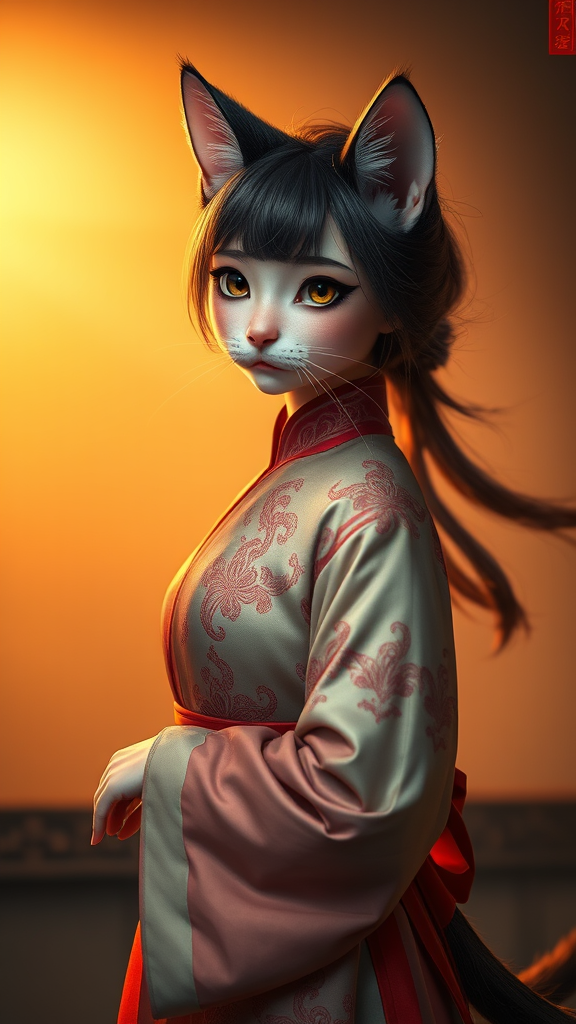 A charming cat girl donning an elegant traditional Chinese dress, inspired by the styles of Guweiz and Wlop, with captivating cinematography-style lighting accentuating her features. Her cat ears and tail are playfully prominent, adding to her whimsical allure, as she poses against a softly lit background that enhances the rich, intricate patterns of her dress. With a serene expression and large, expressive eyes, the scene exudes a harmonious blend of fantasy and cultural elegance. Her flowing hair reflects subtle highlights, creating a dreamy atmosphere around her enchanting presence.
