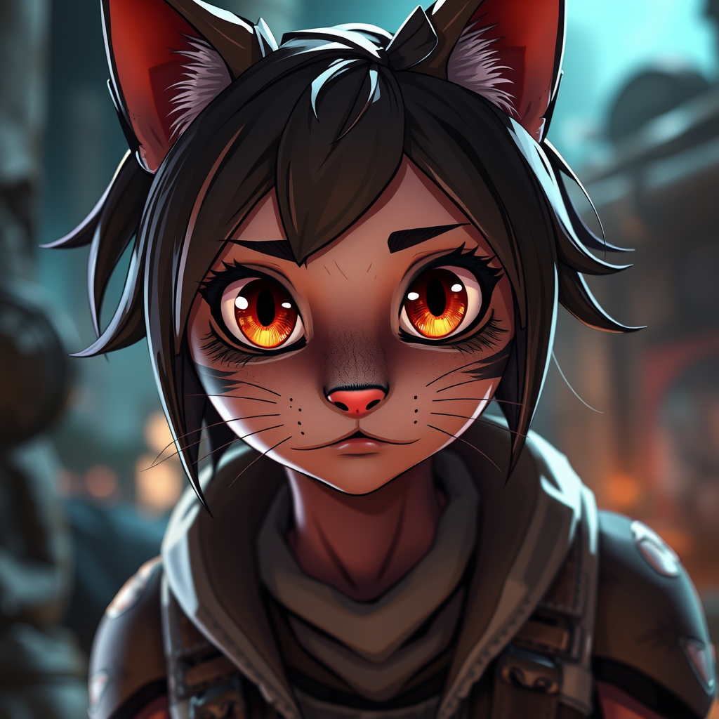 A charming cat girl with expressive eyes, featuring the artistic flair of Yoji Shinkawa and Guweiz, captured in the gritty, cel-shaded style of Borderlands. The scene is rendered with the cutting-edge realism of Unreal Engine and Octane Render, showcasing incredible depth of field and striking, cinematic lighting. Enhanced with 8k UHD clarity and raytraced effects, the setting emphasizes vivid textures and dynamic contrasts, creating an immersive visual experience that blends cuteness with a touch of adventure.