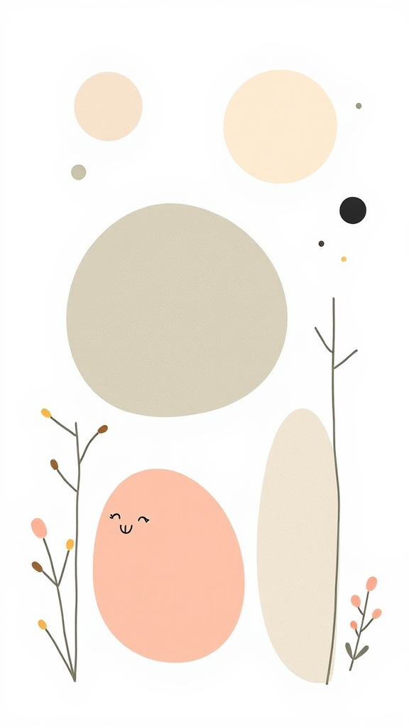 A charming clipart featuring whimsical organic shapes reminiscent of Jon Klassen's style, utilizing a gentle, desaturated pastel color palette with a light and airy feel, set against a crisp white background, ideal for nursery art, with a 9:16 aspect ratio.