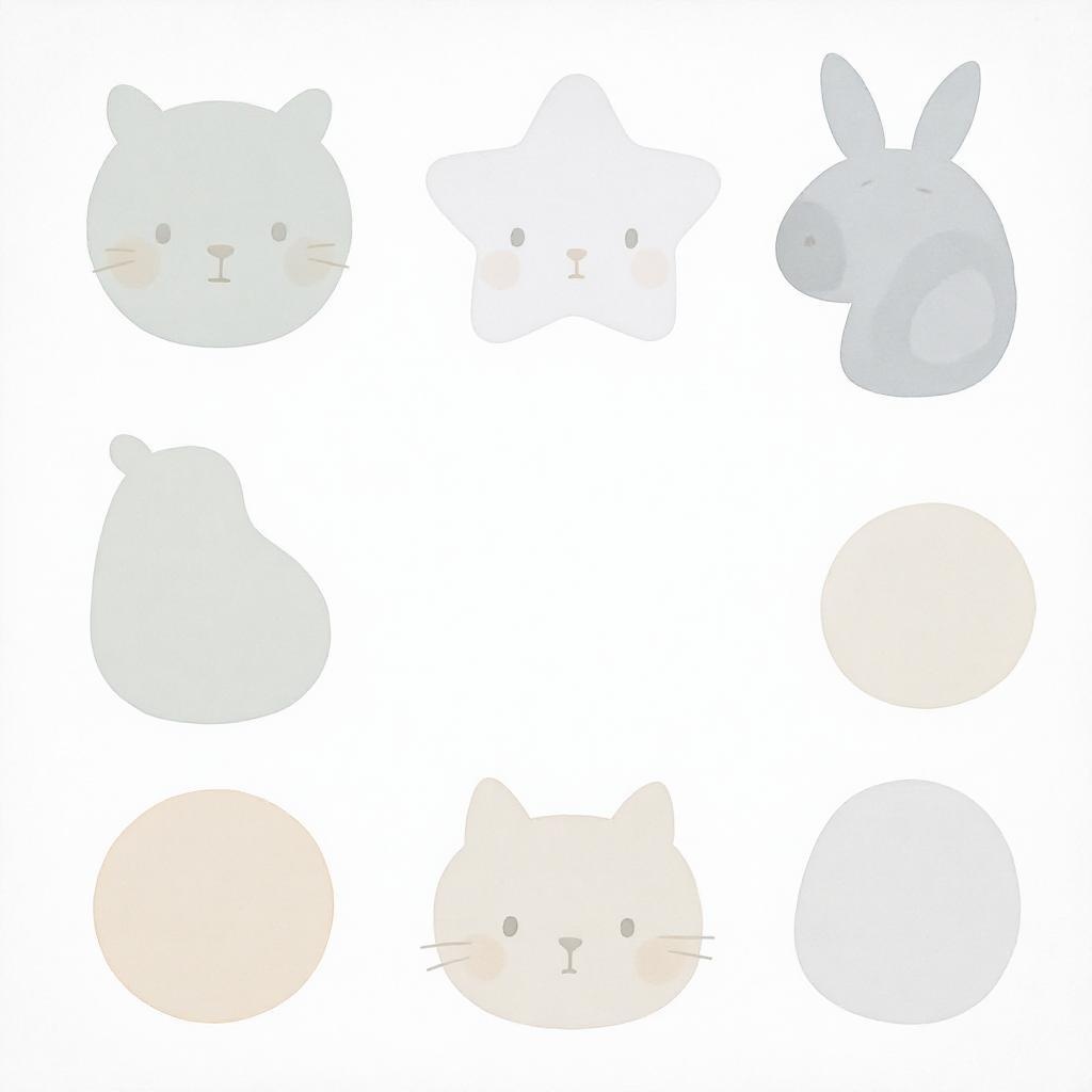 A charming clipart featuring whimsical shapes reminiscent of Jon Klassen's signature style, with soft, muted pastel hues that evoke a light and airy feel, perfect for a nursery setting, set against a clean white background, capturing an organic and playful essence.