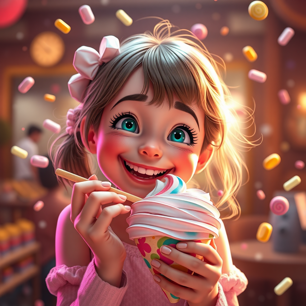 A charming, delightful girl joyfully savoring a swirl of colorful ice cream, surrounded by a whimsical flurry of candies dancing in the air. The scene is reminiscent of Pixar and Disney animation, with cinematic lighting that captures the magic and warmth of her smile. The atmosphere is radiant and enchanting, akin to the immersive visuals of a video game in stunning 8k resolution, blending elements of fantasy and love to create a heartwarming masterpiece.