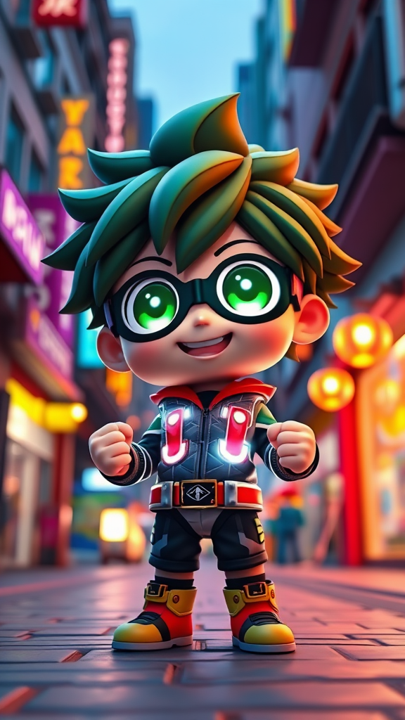 A charming depiction of Izuku Midoriya, reimagined as an adorable chibi figure, stands cheerfully on a vibrant city street. This 3D rendered masterpiece features Midoriya with big, sparkling eyes filled with excitement and a joyful expression. Enhanced by studio-quality lighting, the scene showcases intricate details, reminiscent of Pixar's style. The character's luminous, semi-translucent body exudes a kawaii charm, leaning into a pop art aesthetic. Set against a striking solid color backdrop, Midoriya is positioned among toy-inspired elements reflecting the playful atmosphere of a Magic Space Warehouse. The figure is crafted with an OC renderer in a style similar to pop mart collectibles. Despite the high complexity, the rendering maintains clarity, evident even in 8K resolution. The design nods to a chibi format with petite, toddler-like proportions, channeling youthful exuberance. Midoriya's fists are closed, capturing a sense of determination. The image avoids common pitfalls like distortions or unnecessary text, focusing purely on visual storytelling with flawless execution.