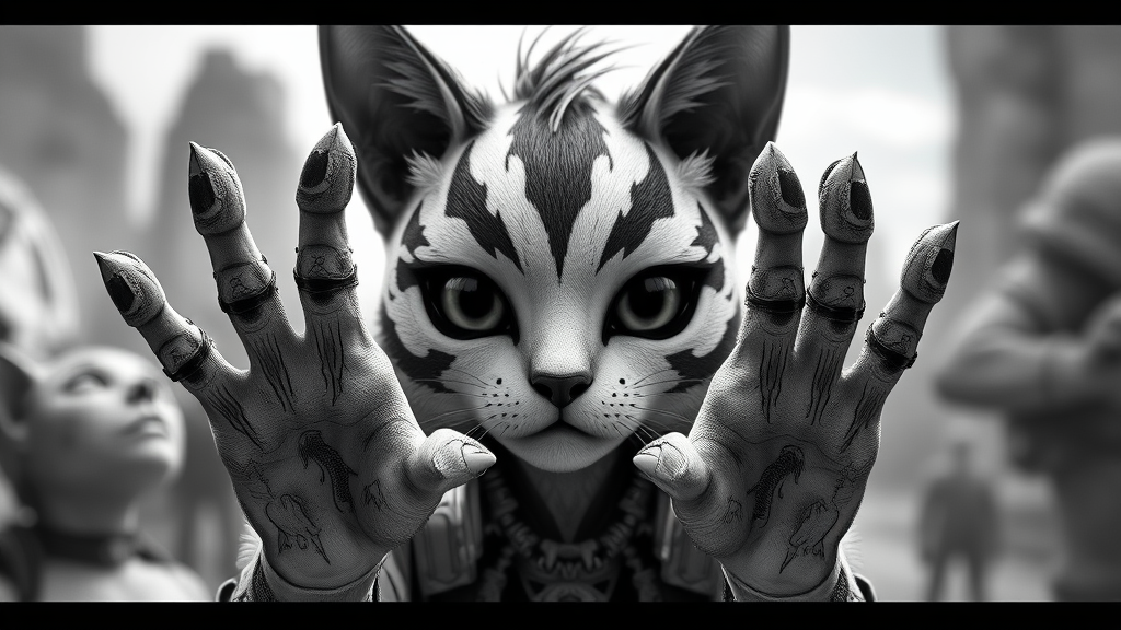 A charming, feline-inspired character created through the collaborative vision of Yoji Shinkawa and Guweiz, set in the bold, graphic universe reminiscent of Borderlands. Captured through the advanced capabilities of the Unreal Engine and Octane Render, this piece is presented with a cinematic feel featuring depth of field and stunning 8k UHD resolution with raytracing effects. Its aesthetic is monochrome and grayscale, evoking a timeless yet modern feel. Despite the high-quality techniques, the image retains a deliberate artistic imperfection with text and logo appearing subtly as if watermarked. The framing is intentionally a bit off, adding dynamic tension, while elements like worst quality, low quality, or lowres aspects and jpeg artifacts play into a styled, textural narrative. Hands and figure are whimsically exaggerated with creative anatomy, pushing boundaries as fingers seem almost arbitrary in number and fusion, providing a surreal, fantasy edge to this imaginative portrayal.