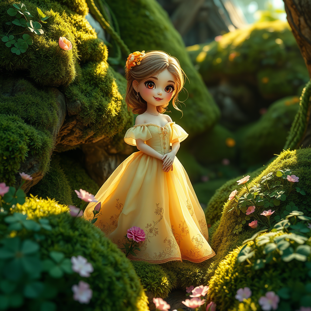 A charming figure dressed in a whimsical gown surrounded by lush moss, vibrant flowers, and clovers, all bathed in gentle sunlight. The setting exudes a dreamy atmosphere with intricate details and sharp clarity, professionally color graded to perfection. This scene is reminiscent of a masterpiece, highly detailed and trending in artistic circles, presented in stunning HDR 8k quality. The composition uses a depth of field effect at f/1.8, enhancing the high contrast and vibrant colors. The illustration maintains a balance between cartoon-like charm and realistic precision, avoiding any disfigurements or errors in anatomy. The focus remains on capturing beauty and elegance without imperfections.