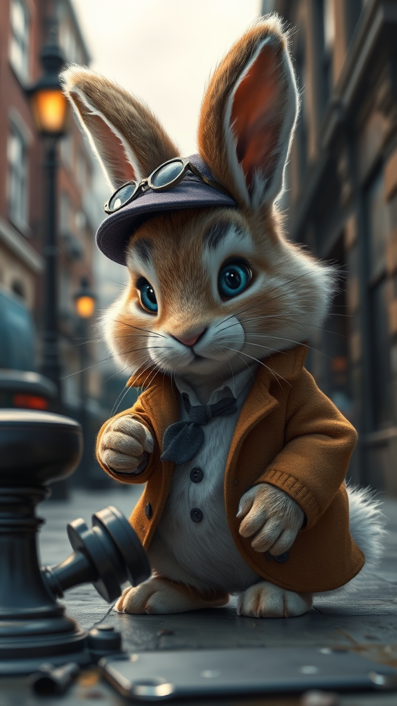 A charming, fluffy bunny cub with blue eyes, donned in a classic Sherlock Holmes ensemble, is intricately inspecting a mysterious crime scene. This Pixar-style visual showcases ultra-detailed features, set against the atmospheric backdrop of old London. The scene emanates a cinematic essence with realistic lighting, captured as if in a studio photo, bringing vivid colors to life. With a photorealistic concept art approach, the composition is meticulously crafted, focusing sharply on the bunny, while enveloped in soft natural volumetric light. The cinematic quality is heightened with perfect illumination, rendered flawlessly in Unreal Engine, creating a dynamic and engaging visual narrative.