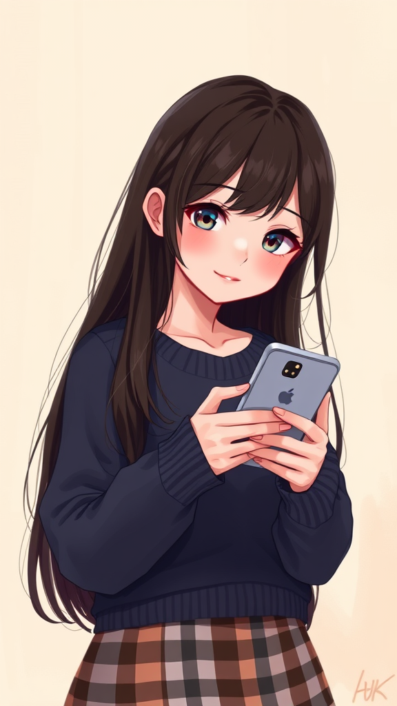 A charming girl with a gentle expression holding a smartphone, dressed in a cozy dark sweater and a stylish checkered mini skirt, her long, flowing dark brown hair framing her face, captured in a vibrant 8k digital painting with soft, warm lighting and subtle background details.
