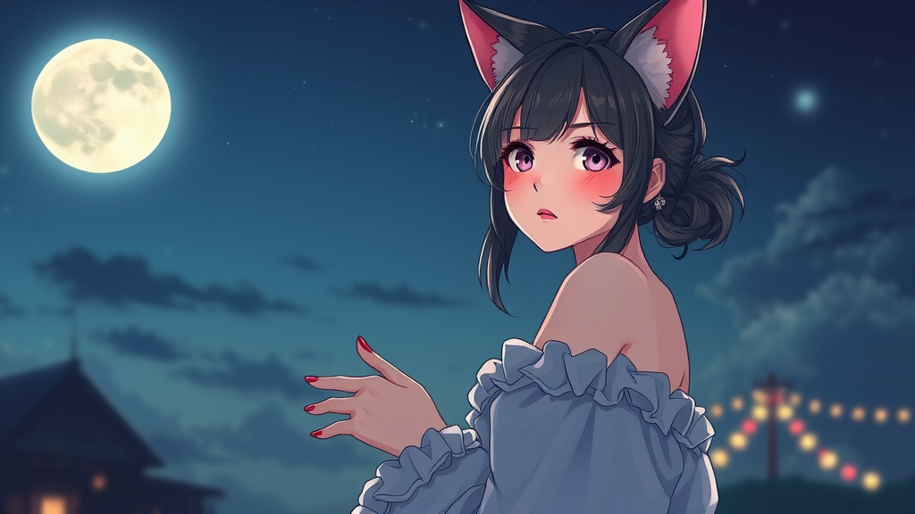 A charming girl with cat ears under the moonlit sky, exuding NIJIFTB elegance, positioned centrally in the composition. The scene captures a key visual that is intricately designed, with each detail meticulously rendered. Her stunning beauty is breathtaking, featuring precise line art and vibrant colors that invoke a comprehensive cinematic feel. Inspired by the artistic styles of Carne Griffiths and Conrad Roset, the image maintains an extraordinarily high resolution at 8k quality, offering a visually stunning experience. Ensuring the absence of technical flaws, the depiction avoids errors such as missing or extra digits, cropped elements, and any signs of jpeg artifacts or signatures. The anatomy is accurately portrayed, with hands and feet well-drawn, and the composition remains fully framed, avoiding tiling or any deformed aspects. The artwork is pristine, devoid of watermarks or artist names, ensuring the pure aesthetic is what captivates the viewer.