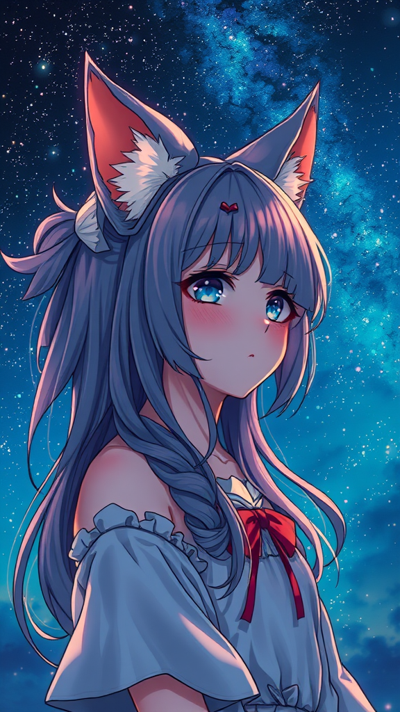 A charming girl with cat ears under the night sky, NIJIFTB, centered, key visual, intricately detailed, with breathtaking beauty, precise lineart, and vibrant colors. The cinematic quality is influenced by Carne Griffiths and Conrad Roset, achieving an 8k high-resolution image of best quality and visually stunning appeal. Avoid any errors such as missing or extra digits, cropped images, jpeg artifacts, and signatures. Ensure accurate anatomy, avoiding disfigurement, blurriness, and any distractions like watermarks or text, preserving an enchanting and captivating artwork.