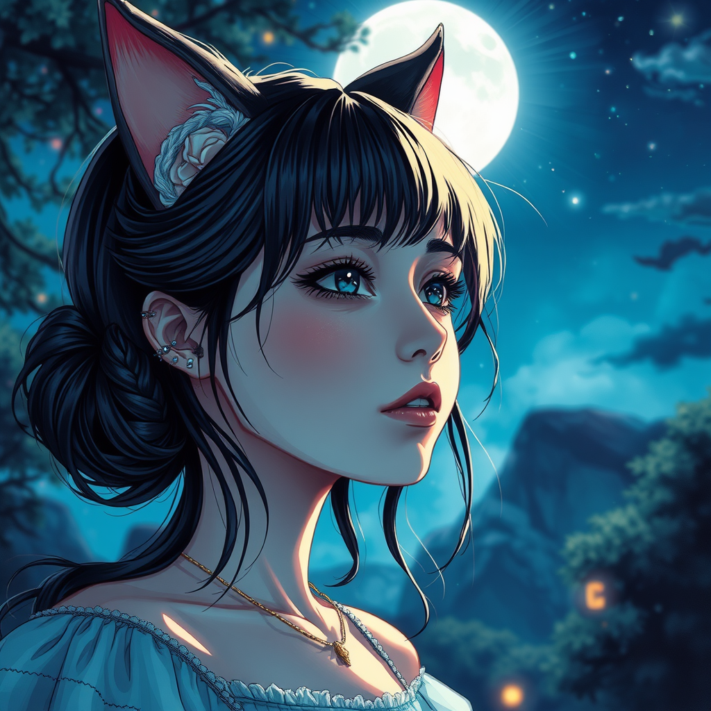 A charming girl with delicate cat ears under the moonlit night, exuding breathtaking beauty with vibrant, intricate details and precise linework. Inspired by the artistic styles of Carne Griffiths and Conrad Roset, the image captivates with its cinematic essence, capturing an 8k stunning visual quality. The scene focuses on enchanting allure, with no distractions such as text or signatures.