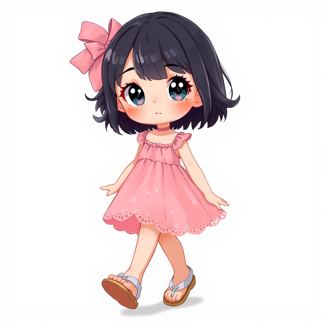 A charming girl with expressive, large anime eyes and glossy obsidian hair, clad in a soft pink sundress adorned with delicate lace trim, gracefully walks in her pastel-colored sandals, exuding a playful and whimsical aura.
