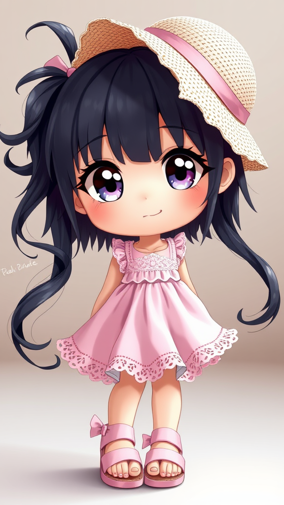 A charming girl with large, expressive anime eyes and striking dark hair, wearing a pastel pink sundress adorned with delicate white lace, paired with matching pink sandals, stands playfully, a small sunhat adding a whimsical touch.