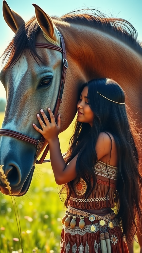 A charming, graceful Indian girl gently embracing the head of a majestic horse, her long hair cascading over her shoulders as she gazes lovingly into the horse's eyes, surrounded by the serene beauty of a sunlit meadow.
