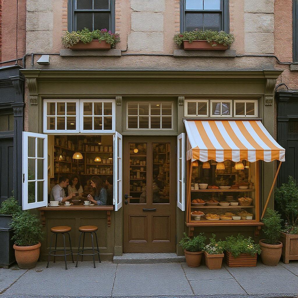 A charming ground-level coffee-bakery shop in New York features white window frames that open upwards, giving the shop an inviting feel. To the left of the central entrance, a warm, bustling atmosphere is created with bistro stools and a wooden counter where patrons enjoy their coffee, their chatter blending with the city sounds. On the right, a cheerful tent with diagonal orange and white stripes provides shade over the window display, drawing in passersby with its lively pattern. The shop's facade is adorned with earthy tones, harmonizing with the urban landscape, while planters with lush greenery add a touch of nature to the scene, enhancing the cozy yet vibrant vibe of the establishment.
