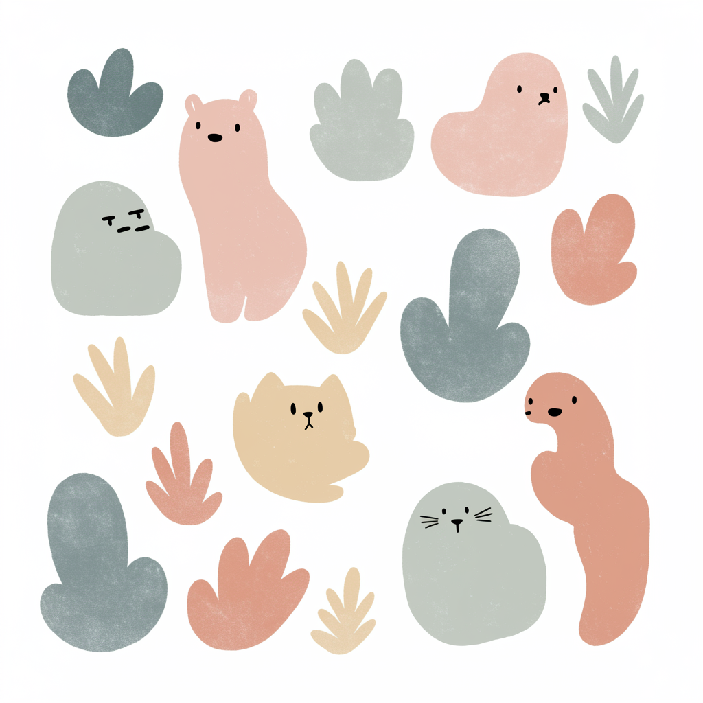 A charming illustration featuring playful organic shapes, inspired by Jon Klassen's unique style, incorporating a soft and airy pastel color palette on a white background, ideal for a nursery setting.