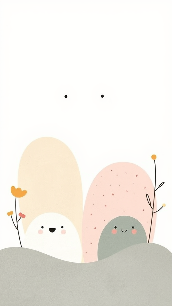 A charming illustration featuring whimsical organic shapes in the style of Jon Klassen, utilizing a soft and gentle pastel color palette with desaturated tones, set against a clean white background. The artwork exudes a light and airy feel, perfect for nursery decor, capturing a sense of playful innocence while maintaining an elegant simplicity. The overall composition presents an inviting and serene atmosphere.