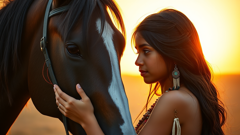 A charming Indian girl gently embracing a gleaming horse's head, her dark hair cascading over her shoulder as she gazes tenderly into its wise, soulful eyes, the sun setting behind them in a warm, golden glow.